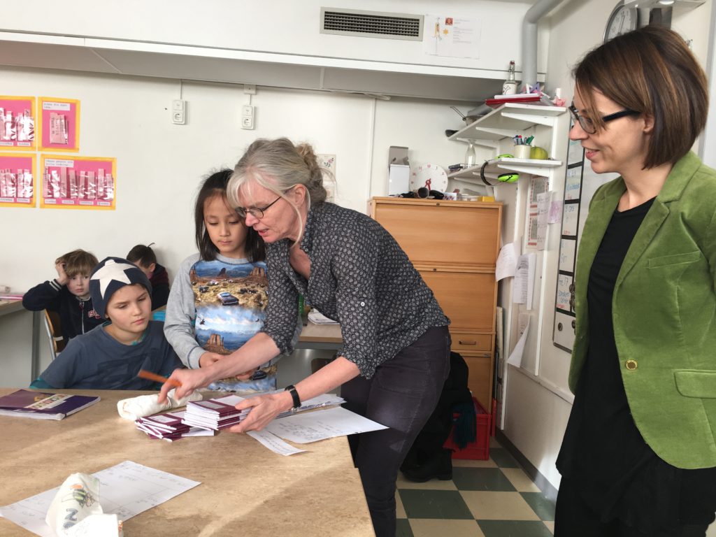 August Dagnekvist och Björn Lindergård går igenom intervjusvaren med sin lärare Sara Nielsen. MiniBladets journalist Lotte Lannerberth är på plats för att rapportera. Foto: Maria McShane