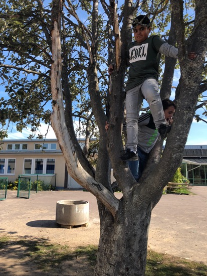 Vi barn vill ha fler klättersaker att klättra på för annars klättrar vi på träd istället. Men några elever skadar sig när de klättrar upp i trädet.