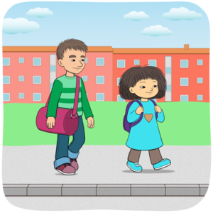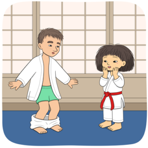 Minja och Mino går på karate på tisdagar. Idag är det tisdag. Minja och Mino går till dojon. Dojon är där man tränar karate.