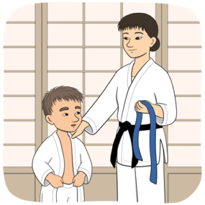 Mino får låna bälte av en tränare som har två bälten.